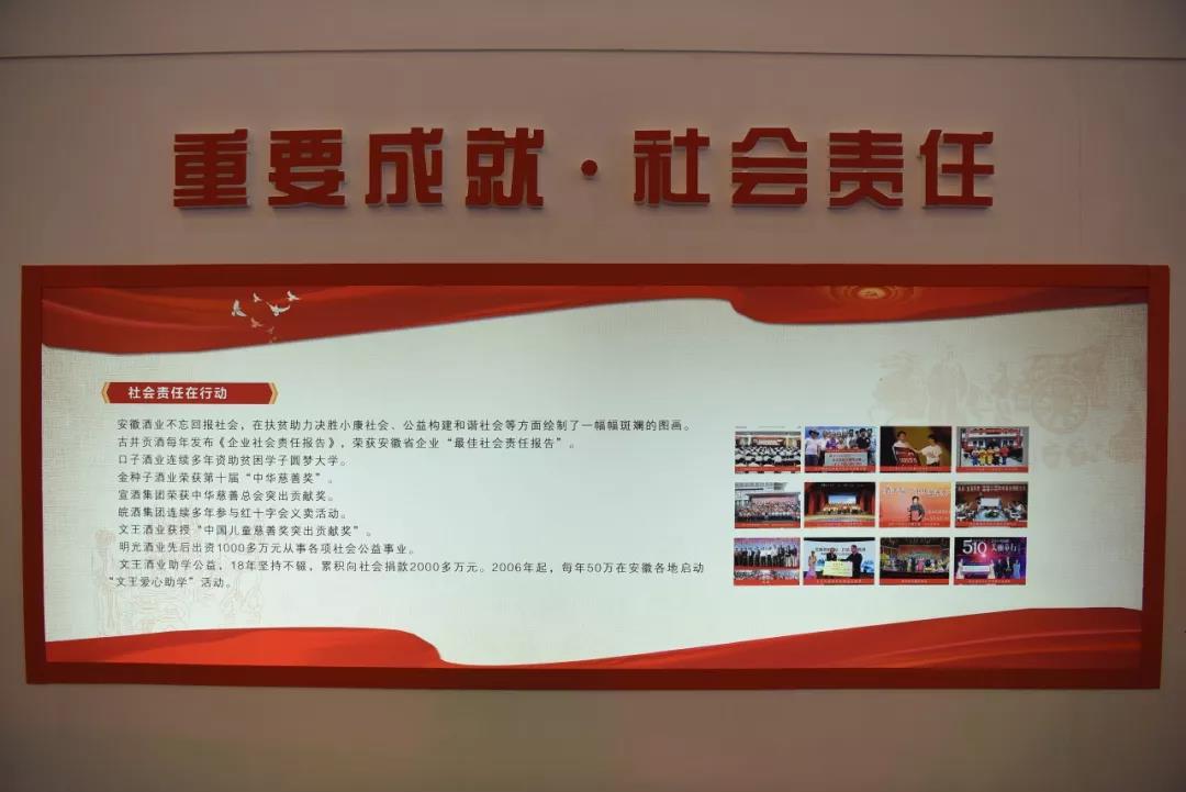 古井貢酒以“中華第一貢”為旗幟,以“做真人,釀美酒,善其身,濟(jì)天下”為價(jià)值觀,每年發(fā)布《企業(yè)社會責(zé)任報(bào)告》,踐行國企擔(dān)當(dāng)。金種子酒業(yè)榮獲第十屆“中華慈善獎”,是中國慈善領(lǐng)域的最高政府獎。宣酒集團(tuán)實(shí)施“春蕾、棟梁、敬老、助殘”四大工程,榮獲中華慈善總會突出貢獻(xiàn)獎。文王酒業(yè)在助學(xué)扶貧等方面作出突出貢獻(xiàn),獲授“中國兒童慈善獎突出貢獻(xiàn)獎”。明光酒業(yè)履行社會責(zé)任,先后出資1000多萬元從事各項(xiàng)社會公益事業(yè)。